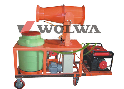 移動式除塵噴霧機是以旋轉式風送低量噴霧為核心技術的新型高效施藥機具。推車式除塵噴霧機主要由水泵、電機、風機、大流道藥液輸送系統、轉盤式離心霧化器等主要零部件組成。